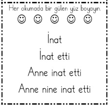 i harfi hızlı okuma metinleri,  her bir sayfa 6 öğrenci içindir. Kolay kelimelerle oluşturulmuş karesel metin hazırlığı olarak değerlendirilebilir. Okumanın takibi için gülen yüz boyanma