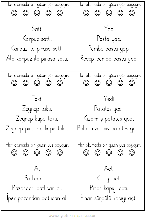 p harfi hızlı okuma metinleri,  her bir sayfada 6 farklı hızlı okuma metni vardır. Kolay kelimelerle oluşturulmuş karesel metin hazırlığı olarak değerlendirilebilir. Okumanın takibi için gülen yüz boyanma bölümü eklenmiştir.  Faydalı olması dileğiyle.