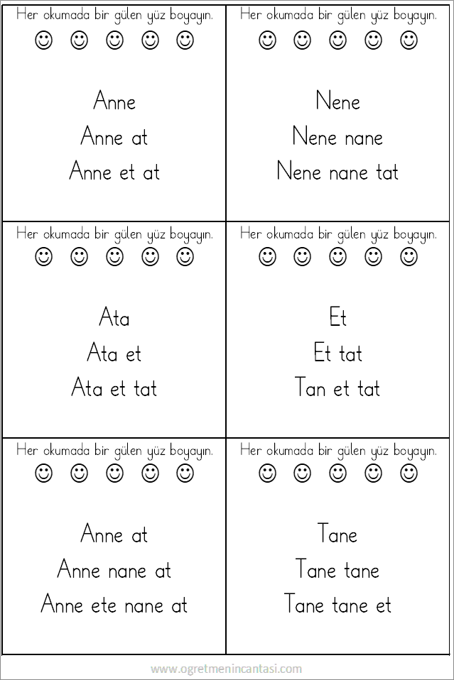 T harfi hızlı okuma metinleri, her bir sayfada 6 farklı hızlı okuma metni vardır. Kolay kelimelerle oluşturulmuş karesel metin hazırlığı olarak değerlendirilebilir. Okumanın takibi için gülen yüz boyanma bölümü eklenmiştir. Faydalı olması dileğiyle.